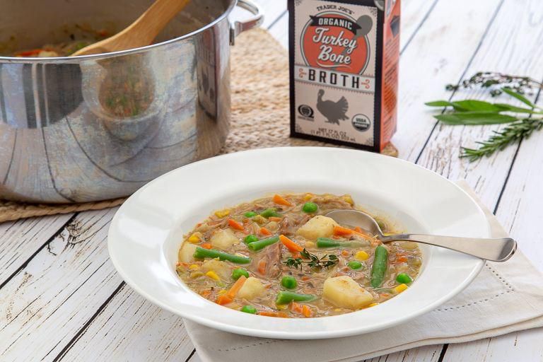 Organic Turkey Bone Broth While plain broth doesnt seem like much of a snack, it definitely packs in protein and nutrients. Flavored with apple cider vinegar, onions, carrots, and more, this turkey bone broth is the ideal pick-me-up to warm you from the inside out. Per serving : 60 calories, 0 g fat (0 g saturated fat), 1 g carbs, 1 g sugar, 170 mg sodium, 0 g fiber, 9 g protein Trader Joe's