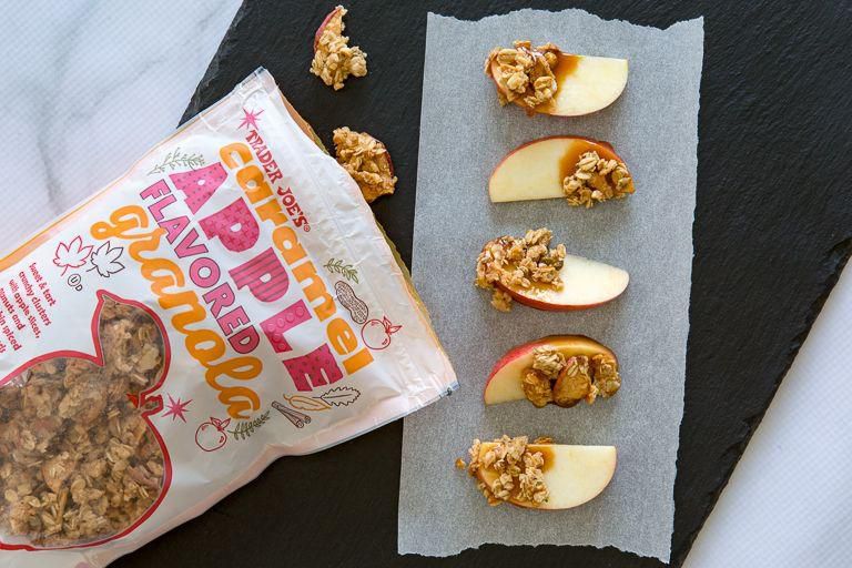 Caramel Apple Flavored Granola If you cant make it to the county fair, the autumnal flavors of caramel and apple in your morning granola make a pretty awesome alternative. Per serving : 250 calories, 8 g fat (1 g saturated fat), 39 g carbs, 13 g sugar, 125 mg sodium, 4 g fiber, 6 g protein Trader Joe's