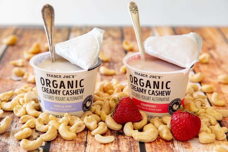 Organic Creamy Cashew Cultured Yogurt Alternative No-dairy? No problem. Youll want to devour this dairy-free yogurt , which comes in vanilla bean and strawberry flavors, all topped off with a hint of coconut cream and lemon. Per serving : 140 calories, 6 g fat (1 g saturated fat), 20 g carbs, 12 g sugar, 10 mg sodium, 0 g fiber, 3 g protein Trader Joe's