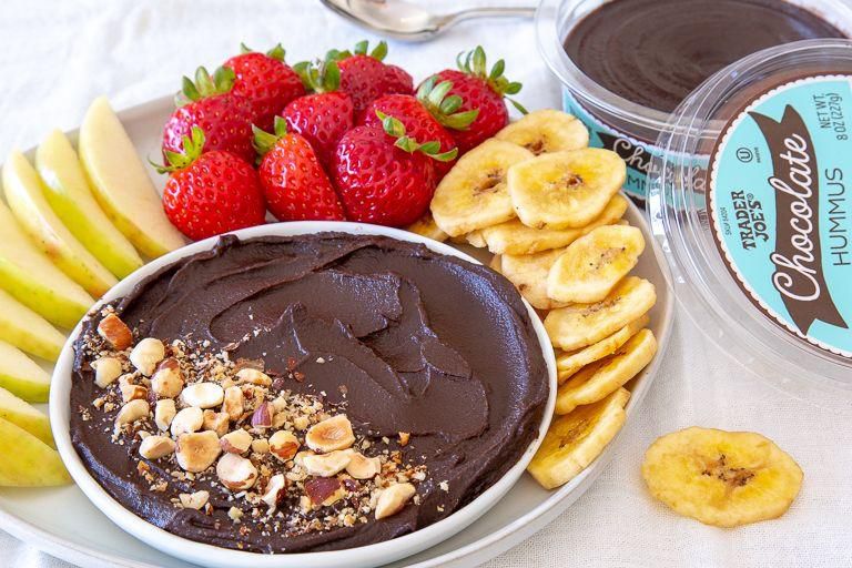 Chocolate Hummus A dash of cocoa and cane sugar in your hummus is actually pretty game-changing. Eat it like you would peanut butter; that is, slathered on fruit or bread, or devoured by the spoonful. Per serving : 50 calories, 1.5 g fat (4 g saturated fat), 9 g carbs, 5 g sugar, 90 mg sodium, 1 g fiber, 2 g protein Trader Joe's