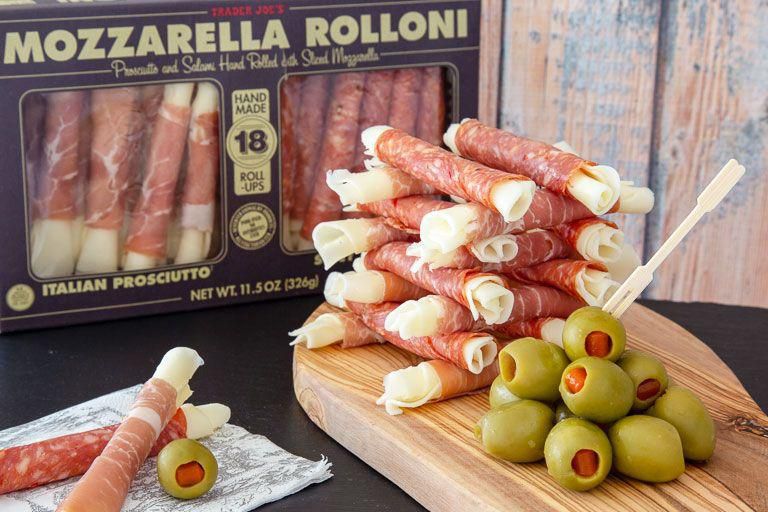 Mozzarella Rolloni Why wait for a special occasion to snack on charcuterie? These pre-rolled meat and cheese bites will help you feel fancy on even the most ordinary of days. Per serving : 270 calories, 20 g fat (5 g saturated fat), 2 g carbs, 0 g sugar, 940 mg sodium, 1 g fiber, 21 g protein Trader Joe's