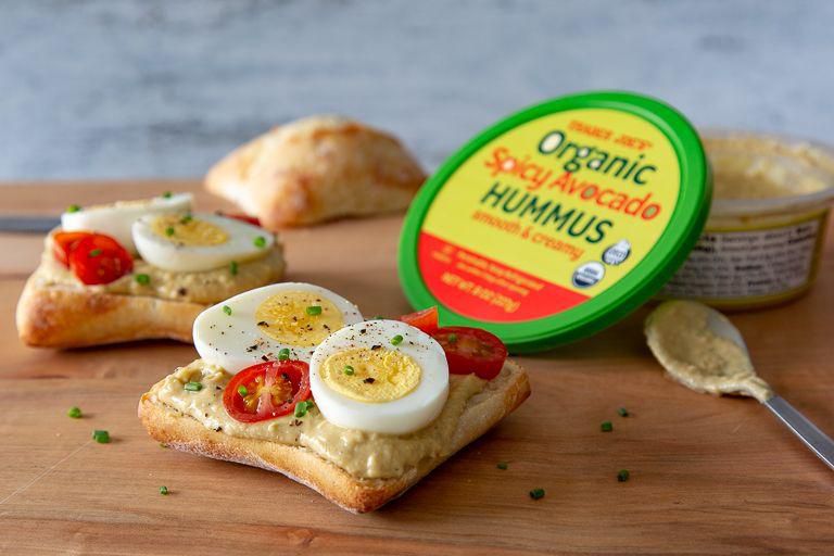 Organic Spicy Avocado Hummus For all those times you cant decide between guac and hummus. Per serving : 60 calories, 4 g fat (0.5 g saturated fat), 5 g carbs, 1 g sugar, 115 mg sodium, 2 g fiber, 2 g protein Trader Joe's