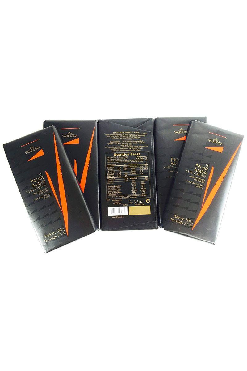 Valrhona Le Noir Amer 71% Cacao Dark Chocolate Bittersweet For Taub-Dix, this brand stands out as having that perfect creamy mouthfeel along with a mouthful of bittersweet bliss. While dark chocolate has been shown to boost circulation and promote heart health, she turns to Valrhona for pure enjoyment. Per serving : 240 calories, 17 g fat (10 g saturated fat), 19 g carbs, 12 g sugar, 0 mg sodium, 6 g fiber, 3 g protein Amazon