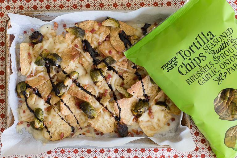 Tortilla Chips Seasoned With Brussels Sprouts Only Trader Joes could pull of Brussels sprouts chips. Per serving : 130 calories, 8 g fat (1 g saturated fat), 16 g carbs, 0 g sugar, 65 mg sodium, 0 g fiber, 2 g protein Trader Joe's