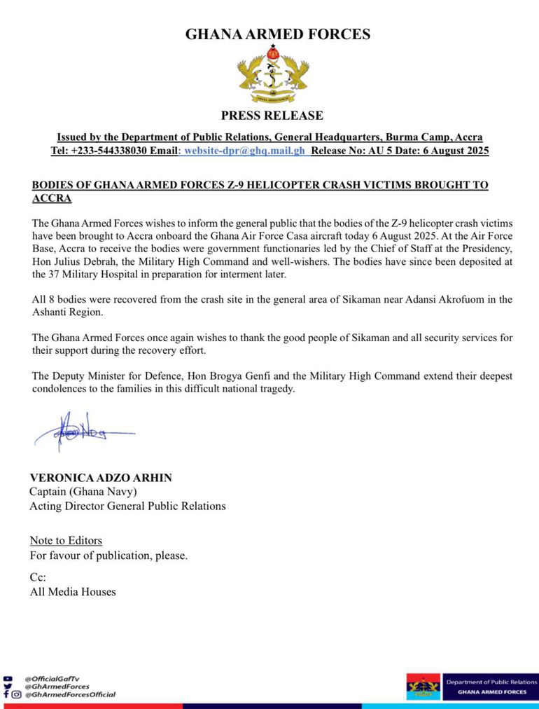 Meanwhile, the bodies of the victims have been airlifted to Accra today, 6 August 2025, onboard a Ghana Air Force CASA aircraft.