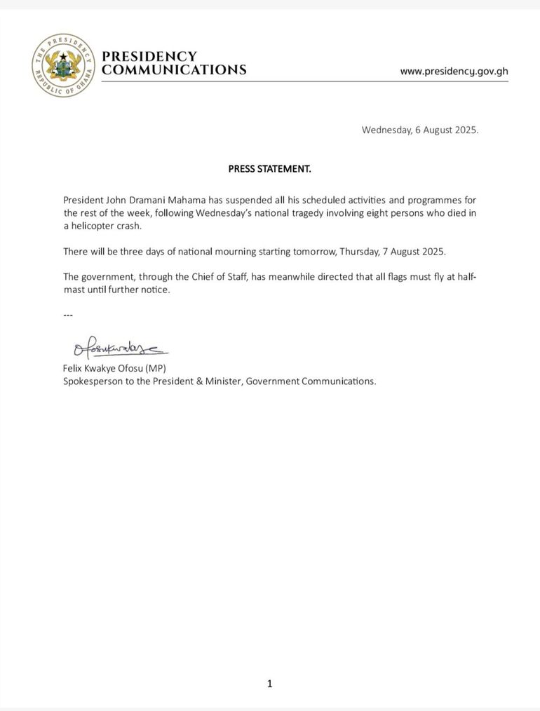 According to the statement, President John Dramani Mahama has suspended all scheduled activities and engagements for the remainder of the week. It further directed that all national flags be flown at half-mast until further notice.