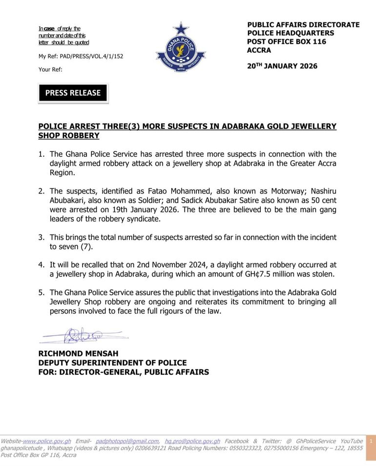 The Ghana Police Service has arrested three additional suspects in connection with the high-profile daylight armed robbery at a jewellery shop in Adabraka, Greater Accra Region.