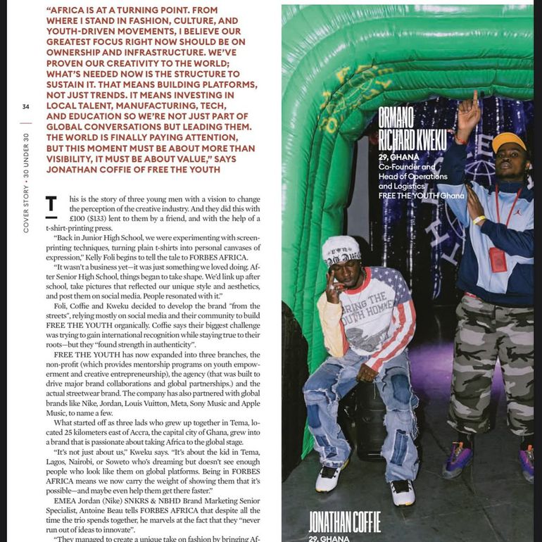 Free The Youth, an Accra collective of creatives, is a fashion dynamo whose electric streetwear fuses kente’s vibrant threads with urban grit, securing their 2025 Forbes Africa 30 Under 30 place in fashion and philanthropy. Their 2024 Africa Fashion Week collection, with Adinkra symbols like Gye Nyame hand-stitched onto bomber jackets, sparked a deal with a global sportswear giant in 2025.