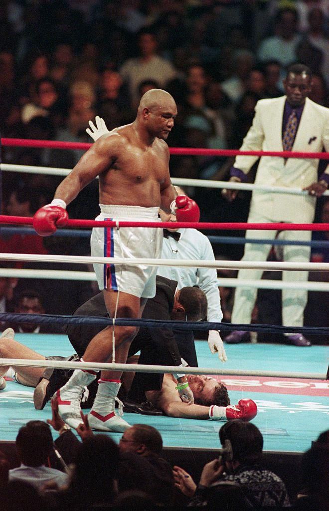George Foreman At age 45, George Foreman reclaimed the heavyweight title by winning a fight against Michael Morrer. This also made him the oldest fighter ever to win the World Heavyweight Championship title. One of the likely reasons he was able to have an impressive career well into his fourth decade is that he retired for 10 years between 1977 and 1987. Bettmann - Getty Images