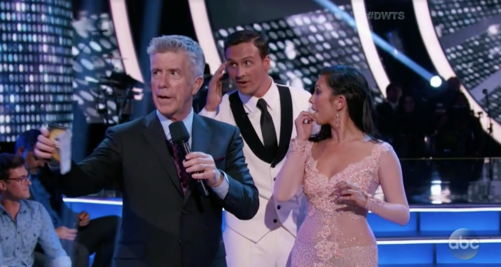 When Ryan Lochte protestors rushed the stage. As you can see in this photo, Ryan and his partner Cheryl were extremely uncomfortable when a group of protestors wearing "anti-Lochte" shirts began yelling in the studioand a few attempted to rush at the athlete. Tom Bergeron dutifully cut to commercial break. The protesters were upset about Ryan's fake robbery allegations during the Rio Olympics. ABC