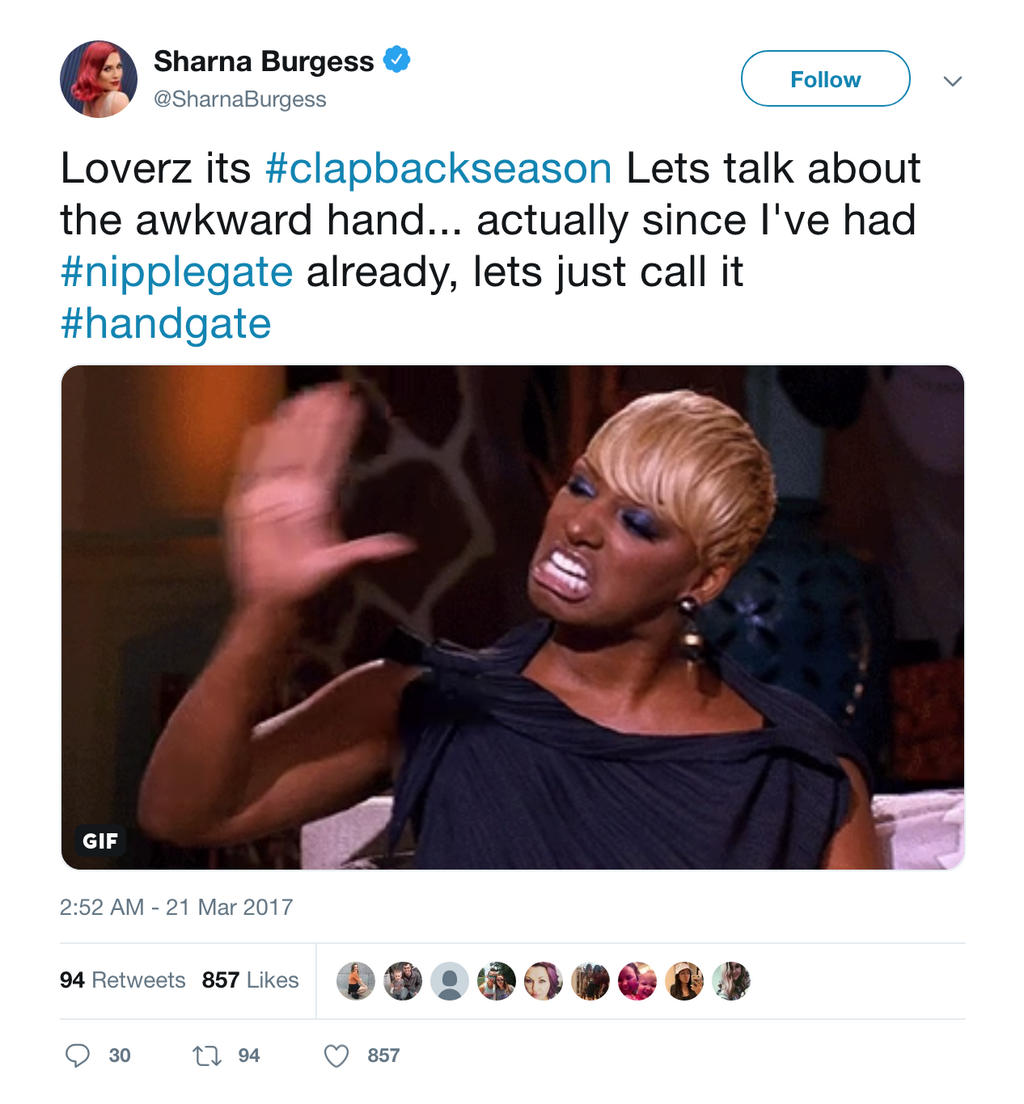 When #handgate happened. Sharna Burgess doesn't embarrass easily (remember her wardrobe malfunction?). But on season 24 that changed when her partner Bonner Bolton accidentally reached a little too far down her front while wrapping his arm around herand the whole thing was caught on camera. The dancer played the awkward moment off by calling it out as #handgate in a tweet. SharnaBurgess - Twitter