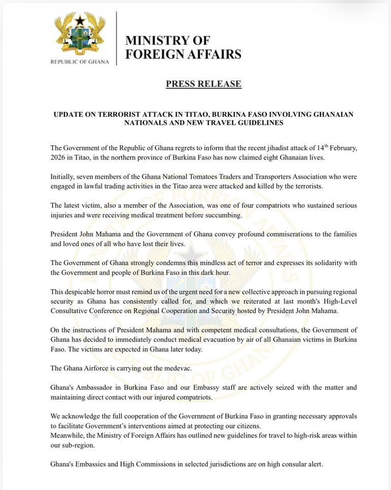 The Government of Ghana has confirmed that eight Ghanaian nationals have died following the 14 February 2026 terrorist attack in Titao, in Burkina Faso’s Northern Province.