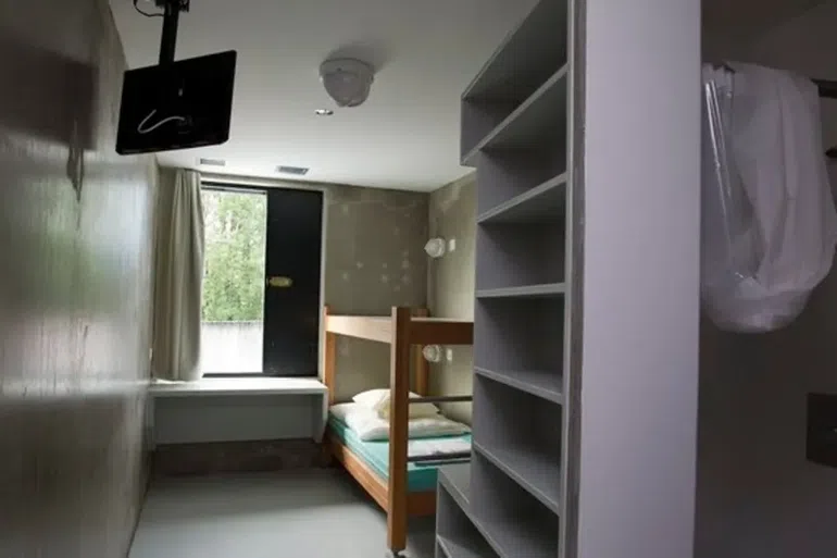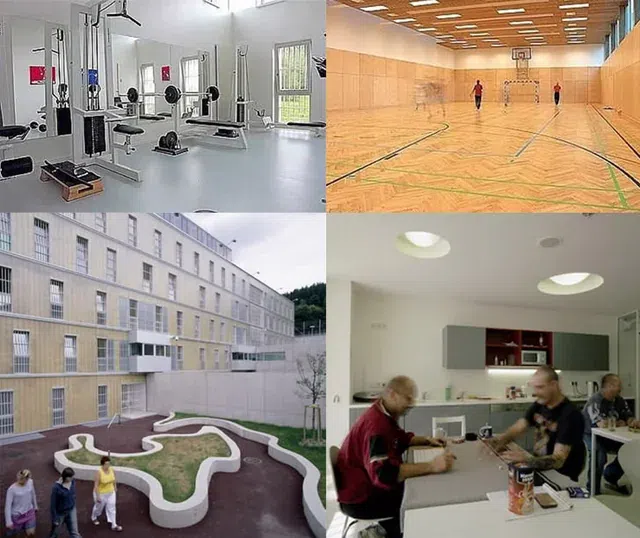 Inmates experience upscale living conditions that include access to natural light, recreational facilities, and personalised cells.