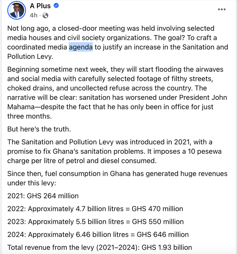Despite the collection of a total revenue of GHS 1.93 billion from 2021 to 2024, A-Plus noted that the levy has failed to yield the desired results, as visible waste remains on streets across the nation.