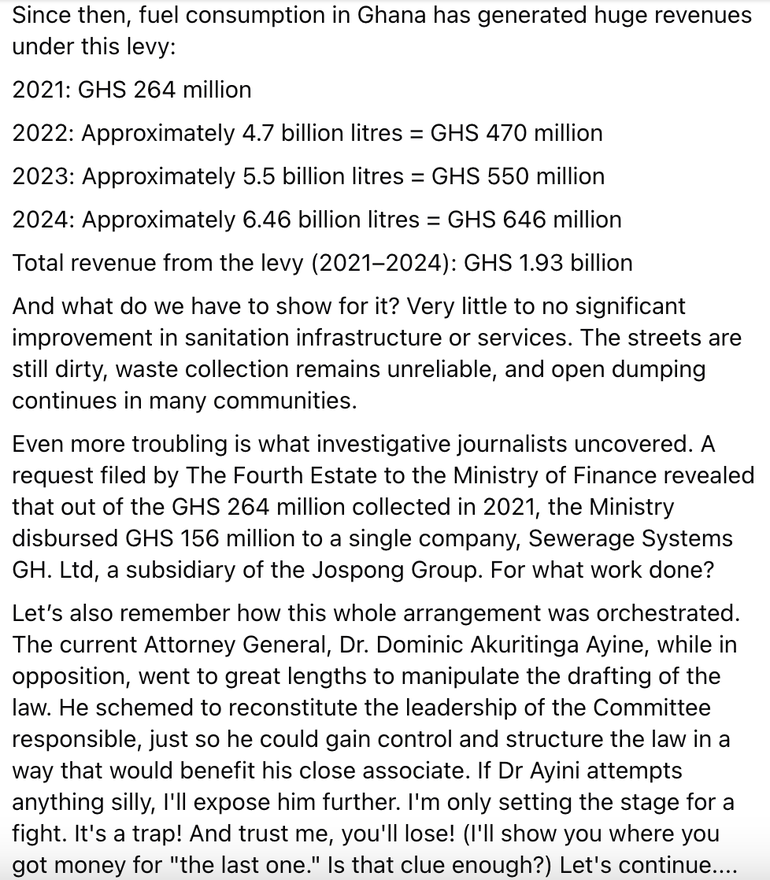 Even more troubling is what investigative journalists uncovered. A request filed by The Fourth Estate to the Ministry of Finance revealed that out of the GHS 264 million collected in 2021, the Ministry disbursed GHS 156 million to a single company, Sewerage Systems GH. Ltd, a subsidiary of the Jospong Group. For what work done?