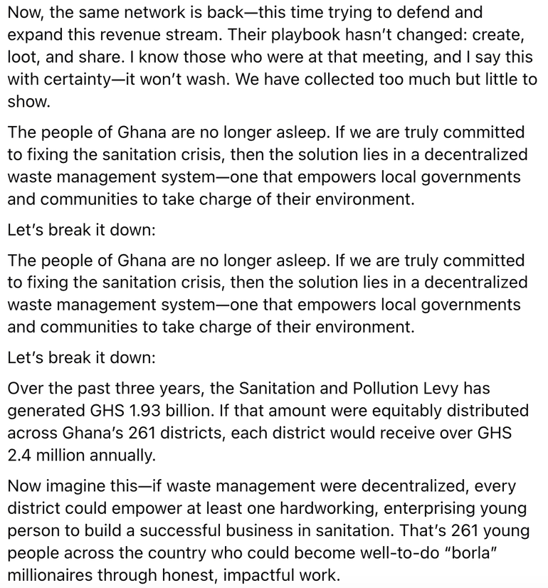 In his post, the MP emphasised that the solution to Ghana’s sanitation challenges lies in a decentralised waste management system—one that empowers local governments and communities to take charge of their environment.