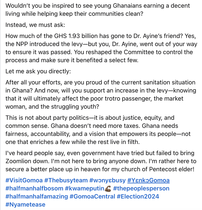 After all your efforts, are you proud of the current sanitation situation in Ghana? And now, will you support an increase in the levy—knowing that it will ultimately affect the poor trotro passenger, the market woman, and the struggling youth?