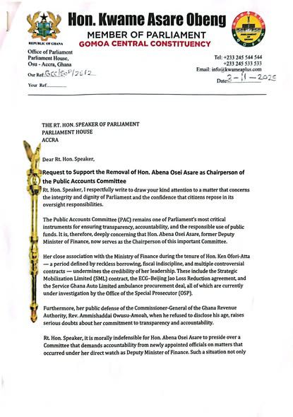 The Member of Parliament for Gomoa Central, Kwame Asare Obeng, popularly known as A-Plus, has formally petitioned Speaker Alban Bagbin to remove Abena Osei-Asare from her position as Chairperson of Parliament’s Public Accounts Committee (PAC).