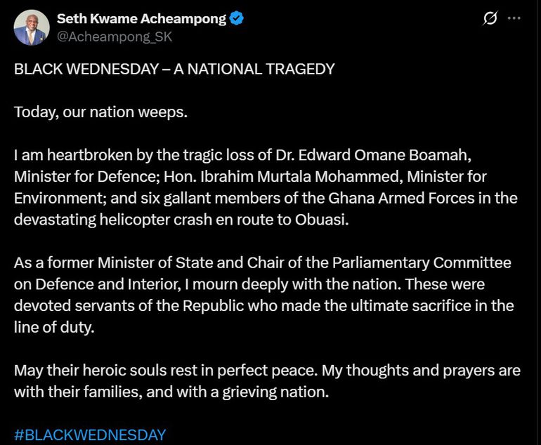 The tragic demise of former Defence Minister Dr Edward Omane Boamah, Environment Minister Dr Ibrahim Murtala Mohammed, and six others in a helicopter crash has sparked a wave of nationwide mourning.