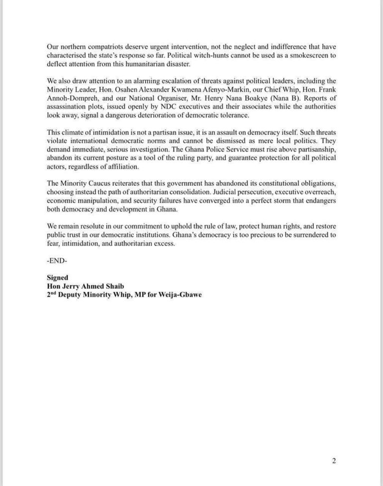 The statement added that such persecution undermines the democratic principles upon which Ghana was founded. It cited escalating threats against political leaders, including the Minority Leader, Alexander Kwamena Afenyo-Markin, the Chief Whip, Frank Annoh-Dompreh, and the NPP’s National Organiser, Henry Nana Boakye (Nana B).
