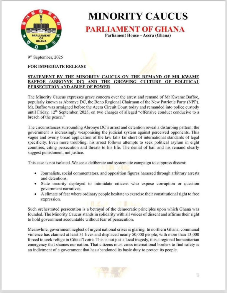 The Minority Caucus in Parliament has accused the government of engaging in political persecution and intimidation against members of the opposition New Patriotic Party (NPP). This follows the arrest and remand of Kwame Baffoe, popularly known as Abronye DC, the Bono Regional Chairman of the NPP.