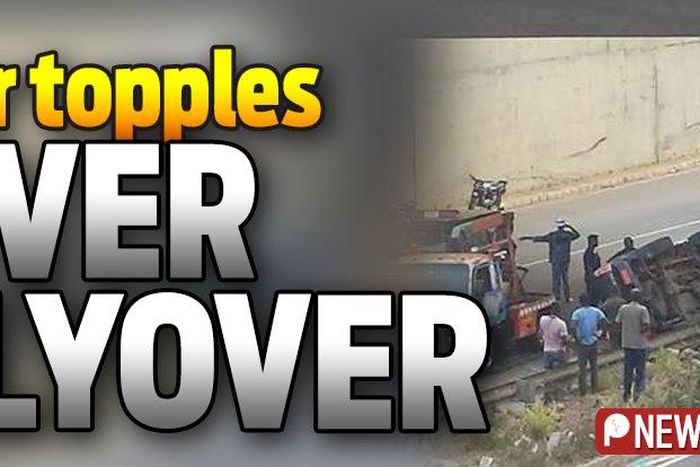 A saloon car accidentally toppled over the flyover at dimples junction, around former Construction Pioneers (CP) site near Dwowulu in Accra on Sunday and in the process fell on another car using the road beneath the bridge.