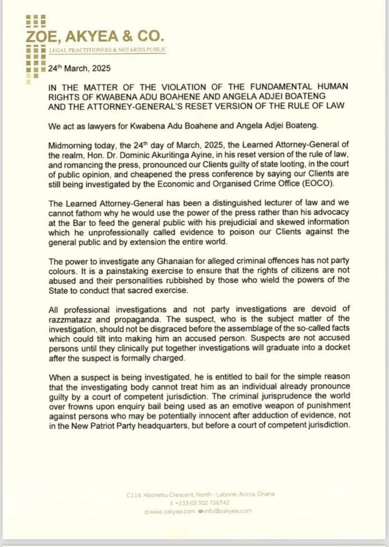 Zoe, Akyea & Co., the legal representatives of embattled former Director-General of the National Signals Bureau (NSB), Kwabena Adu-Boahene, and his wife, Angela Adjei-Boateng, have indicated plans to sue the Office of the Attorney-General (A-G) for defamation.