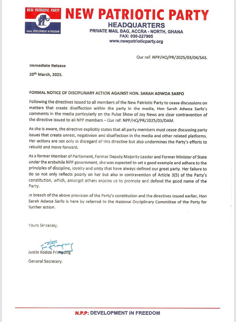 This development follows an earlier directive from the party’s General Secretary, Justin Kodua Frimpong, urging all members to refrain from discussing internal party matters that could create disaffection.