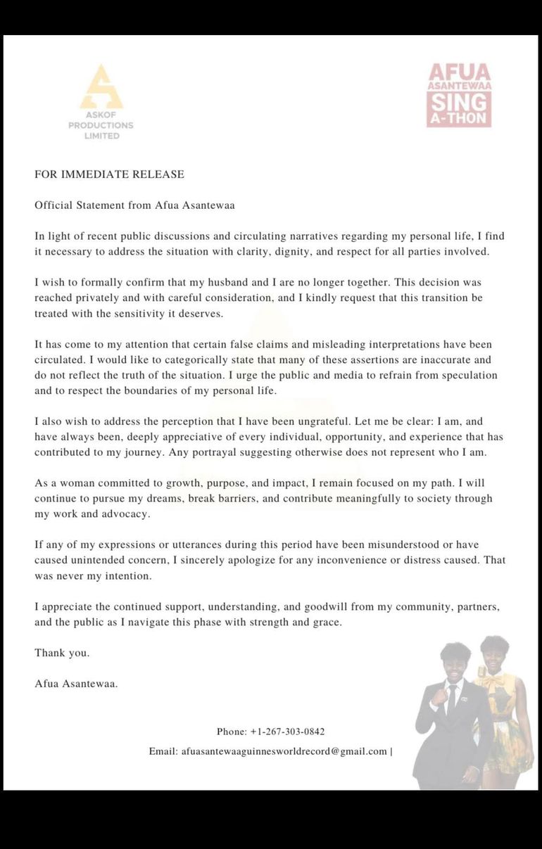 In an official statement released to the public, Afua Asantewaa disclosed that the decision to separate was reached privately after careful consideration, and appealed for sensitivity as she navigates the transition.