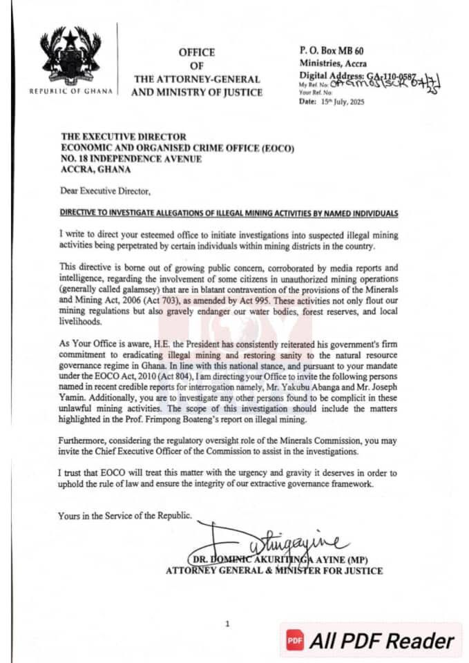 The Attorney General and Minister for Justice, Dr Dominic Ayine, has directed the Economic and Organised Crime Office (EOCO) to initiate investigations into Joseph Yamin, National Organiser, and Yakubu Abanga, National Vice Chairman, both of the ruling National Democratic Congress (NDC), over alleged involvement in illegal mining.
