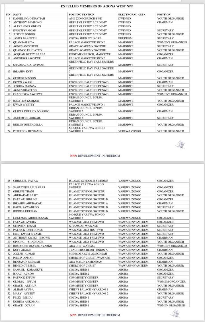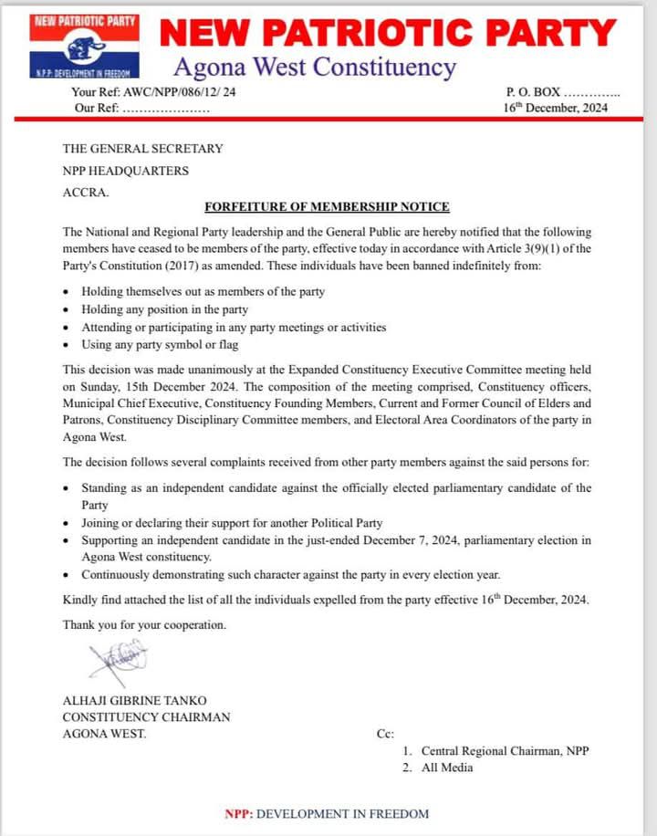 The letter, dated 16th December, indicated that effective immediately, the expelled individuals are no longer members of the NPP. They are barred from holding any positions in the party, attending meetings, or using the party’s symbols and flags.