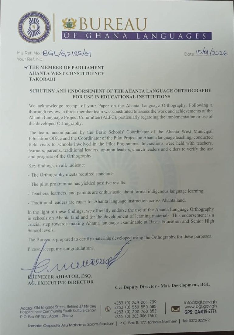 The endorsement is described as a crucial step towards making Ahanta an examinable subject at the basic education and senior high school levels. The Bureau further indicated its readiness to certify teaching and learning materials developed using the approved orthography, a move that will allow schools to begin structured instruction once materials and trained teachers are in place.