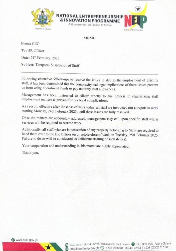 The management of the National Entrepreneurship and Innovation Programme (NEIP) has directed all staff not to report to work from February 24, due to unresolved legal and administrative issues concerning employment and salary payments.