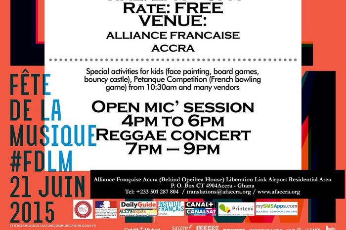 DATE: Sunday 21st JuneVENUE: Alliance Française Accra - Paillote stageTIME: from 2pm to 9pmRATE: Free