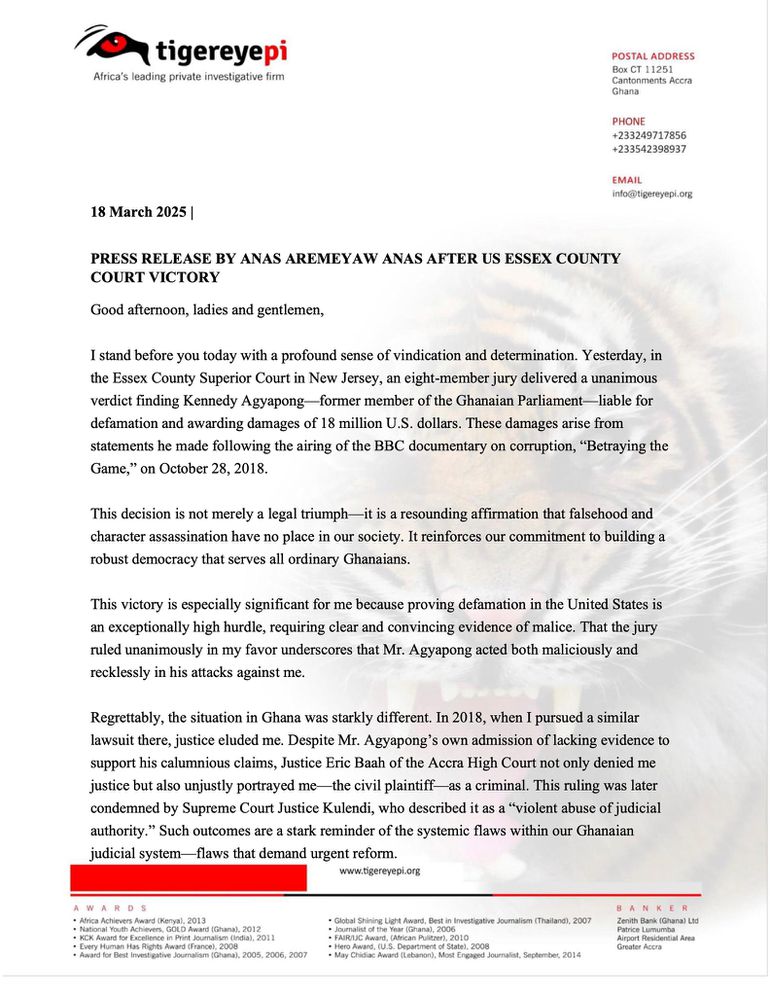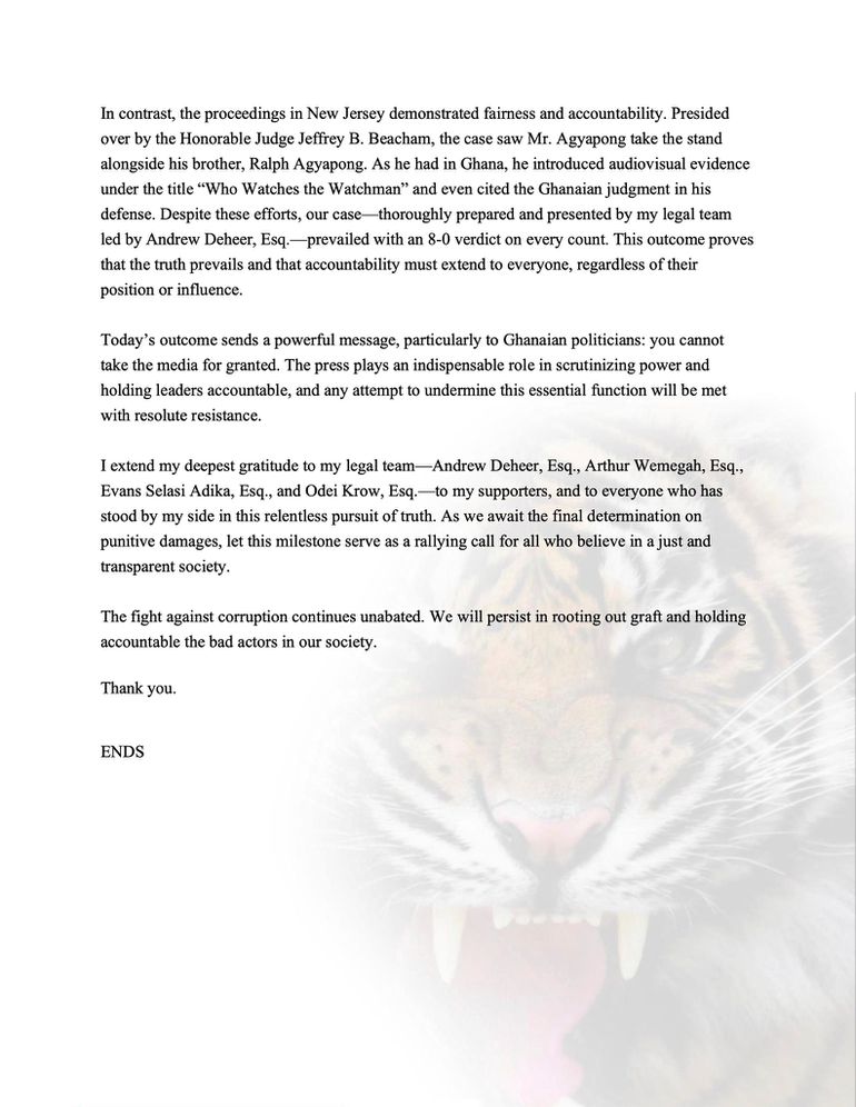 His statement follows a jury verdict from the Essex County Superior Court in New Jersey, United States, which ruled in his favour in an $18 million defamation lawsuit against former Assin Central MP, Kennedy Ohene Agyapong.