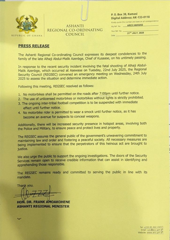 The Ashanti Regional Security Council (REGSEC) has announced a series of robust security interventions following the tragic killing of Alhaji Abdul-Malik Azenzge, Chief of Kusaase, who was gunned down in Asewase on Tuesday, July 22.