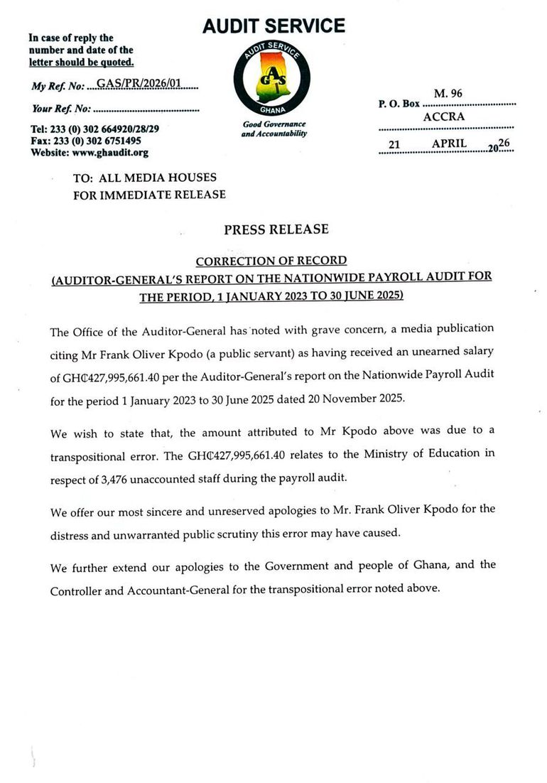 The Office of the Auditor-General has issued a correction to its nationwide payroll audit report, clarifying that a previously reported figure of GH¢427,995,661.40 attributed to a single civil servant was the result of a transpositional error.