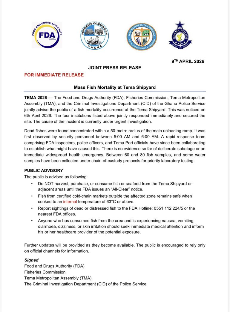 The Food and Drugs Authority and the Ghana Police Service have launched a probe into a fish mortality incident at the Tema Shipyard, with residents advised to stay away.