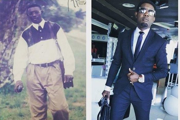 The old picture is framed with a new picture of the comedian. In the old picture, AY is thin and wearing a a big shirt and baggy pants. In the new picture he is rocking a bespoke suit. The two pictures sum up his rise to the top of the entertainment scene in Nigeria.