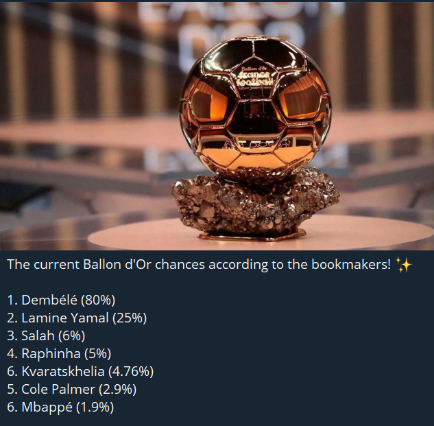 Dembele is the heavy favourite with a whopping 80% chance of being named the best player in the world. Yamal, considered the closest contender, is not so close to the PSG star in terms of his chance of winning.