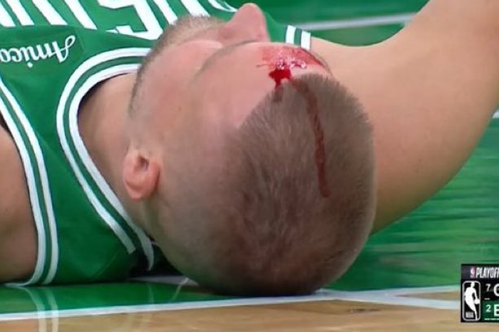 Boston Celtics’ big man Kristaps Porzingis was left bloodied after suffering a head injury during game two of their first-round NBA playoff series against the Orlando Magic.