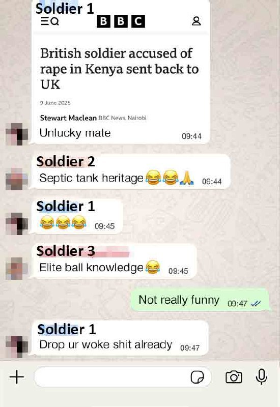 2025 WhatsApp leak revealed former BATUK soldiers laughing at rape victims in Kenya. Source: Cool Buzz TV https://www.youtube.com/watch?v=bGVANxac94g