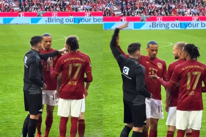 The fourth official appeared to be directing Konrad Laimer who was also coming on but his stretched arm was in Sane’s way. Sane instead of passing behind him or simply prompting him, pushed his arm away before dabbing up Olise.