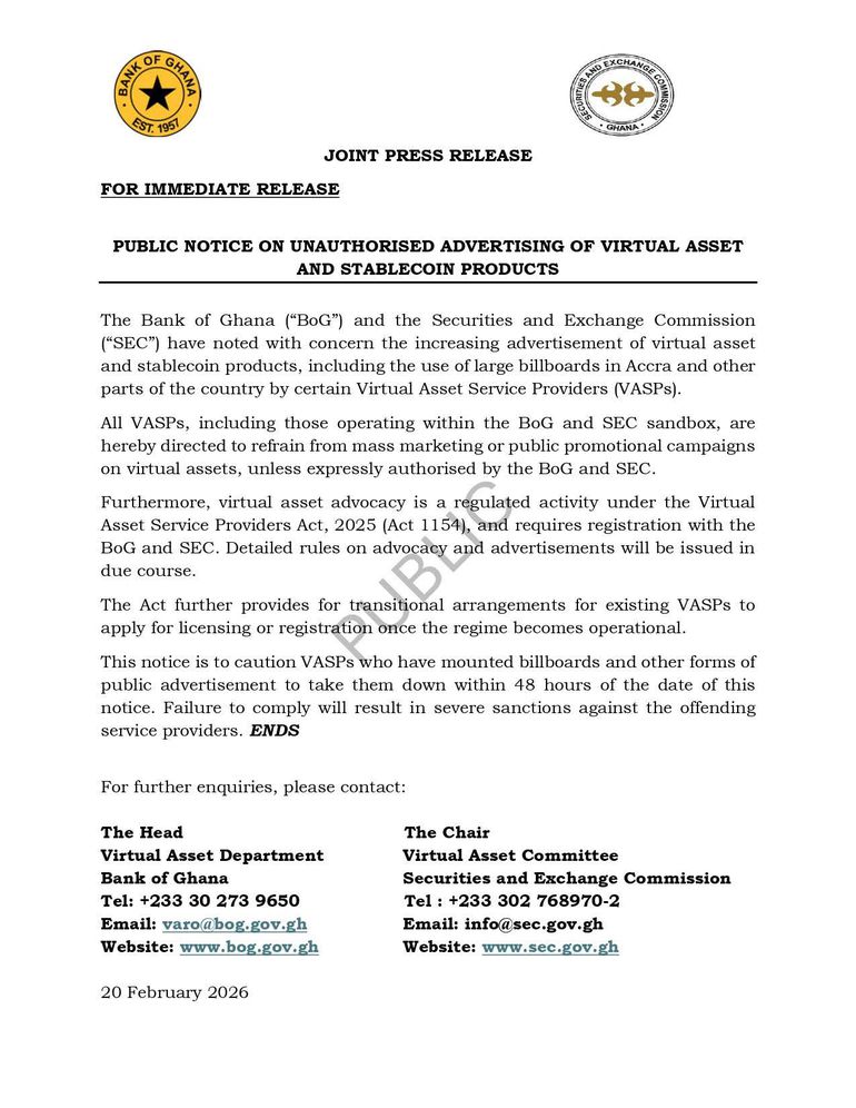 The Bank of Ghana (BoG) and the Securities and Exchange Commission (SEC) have issued a joint public notice cautioning Virtual Asset Service Providers (VASPs) against unauthorised advertising of virtual asset and stablecoin products.