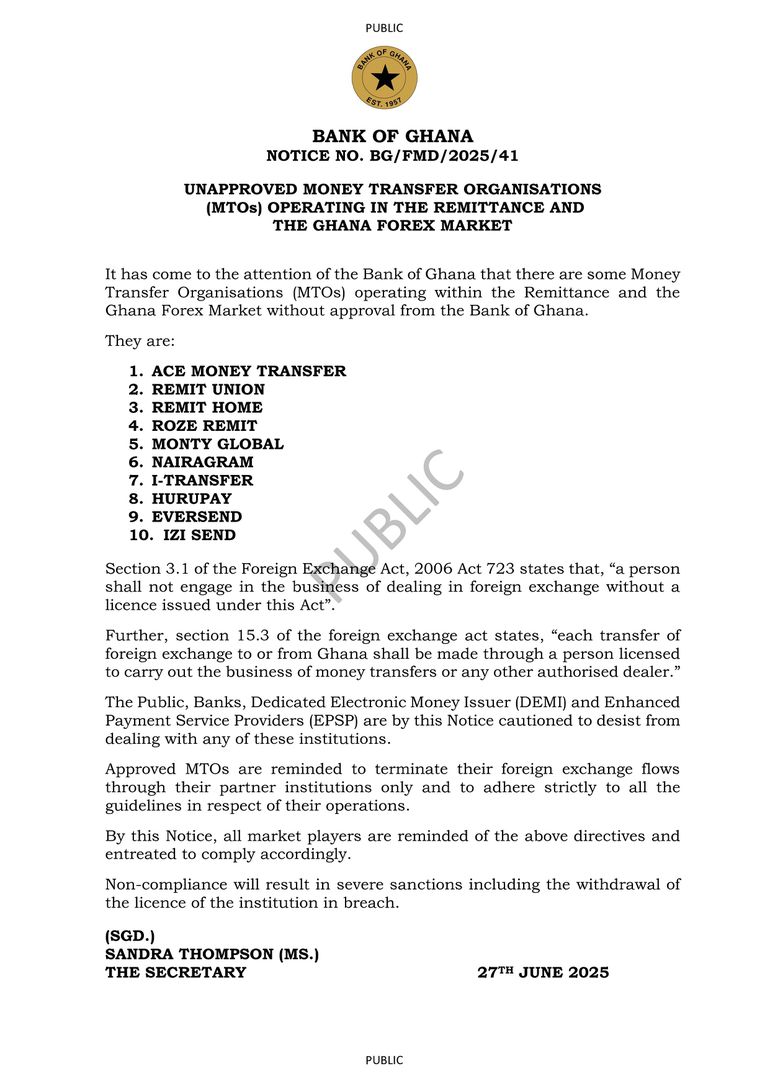 In a statement dated 27th June and signed by Secretary Sandra Thompson, the BoG stated that the activities of these MTOs constitute a violation of Section 3.1 and Section 15.3 of the Foreign Exchange Act, 2006 (Act 723).