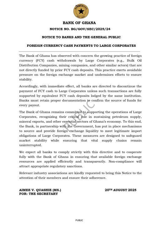 The Bank of Ghana (BoG) has, with immediate effect, directed all banks to cease the payment of unsupported foreign currency (FCY) cash to large corporations as part of measures to ease pressure on the foreign exchange market.