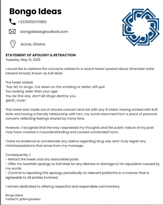 In a statement dated Tuesday, 13 May 2025, Bongo Ideas clarified that the tweet was not meant to malign Kofi Mole but was instead motivated by concern. He explained that having previously worked with the rapper and maintained a cordial relationship, his comment was an emotional response shared by some fans.