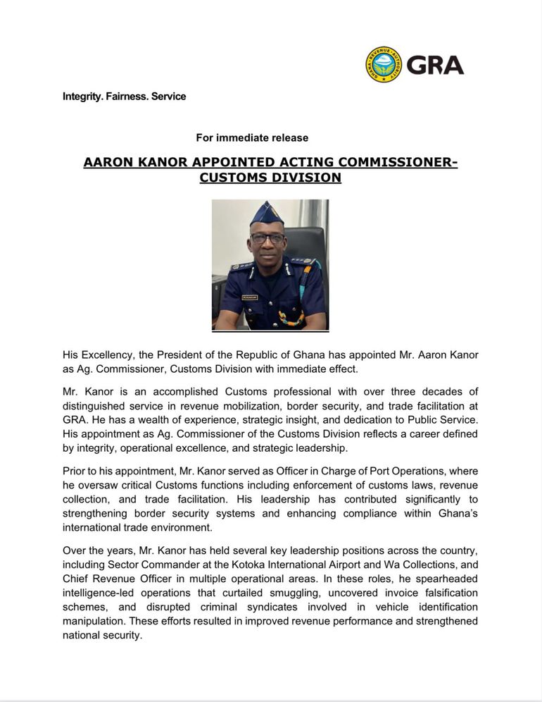 President John Mahama has appointed Mr Aaron Kanor as Acting Commissioner of the Customs Division with immediate effect.