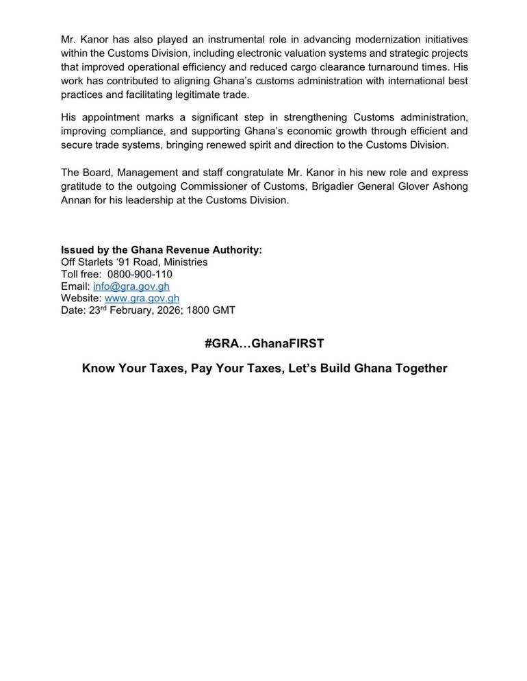 Brig Gen Annan was appointed on March 23, 2025. His removal and Mr Kanor’s appointment were confirmed in a statement issued by the Ghana Revenue Authority on February 23, 2026.