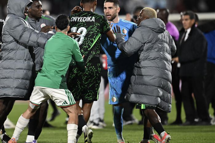 Nigeria's Raphael Onyedika and Algeria 'keeper Luca Zidane square up after Nigeria's 2-0 quarter-final win © Paul ELLIS / AFP
